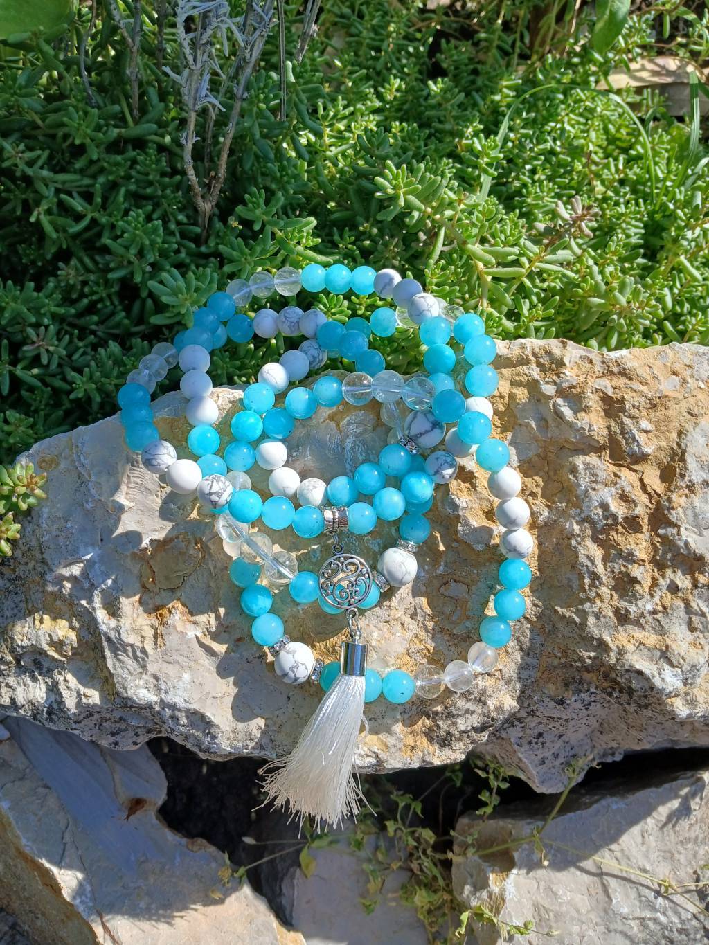 8mm-es  Amazonit, Hegyikristály, Howlit Mala 10mm-es Howlit osztóval